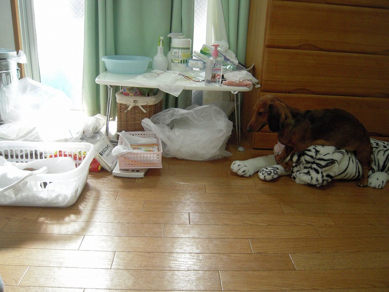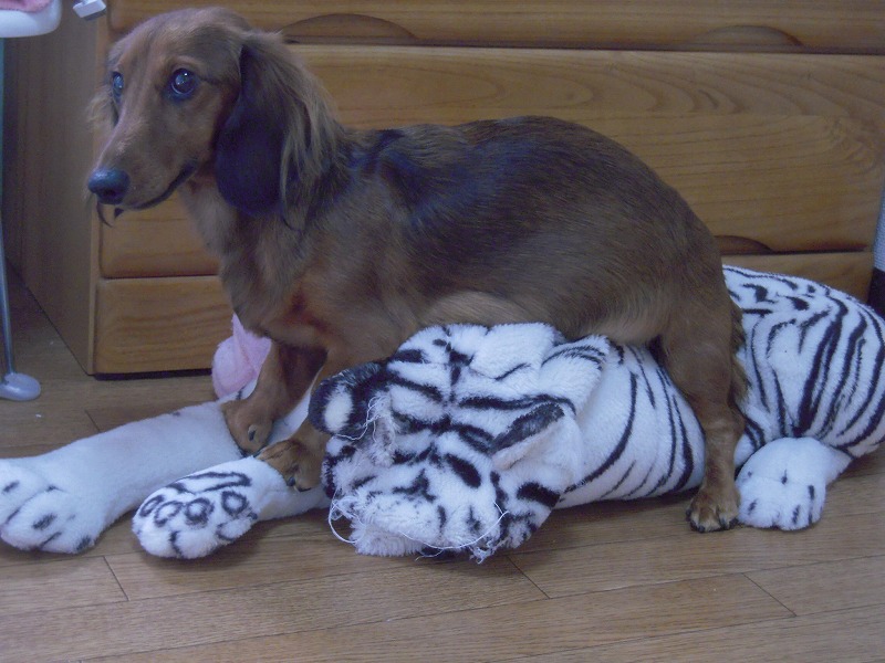 おきにいりのトラのぬいぐるみにおなかをのせ、くつろぐほどの余裕が見られる。
